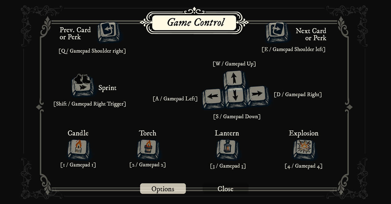 Play the way you prefer. GRAVEHOLDER allows you to freely customize your controls and bind the keys that feel right for you. Whether you play with a keyboard or a gamepad, the choice is yours. Full controller support is included, so you can experience the night exactly the way you want. Simple controls. Precise movement. Total control of the light.